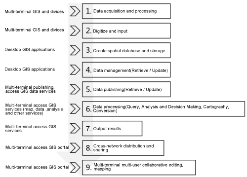 Taking the process of GIS data processing as an example, in the Cloud & Terminal Integration application, the software from cloud to clients are involved in the data acquisition, processing, storage, analysis, distribution. The software of each platform has its own advantages, and performs their correct role in a complete GIS system.