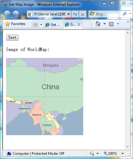 container.innerHTML += '<p>China Image is: </p><IMG id =map src=http://localhost:8090/iserver/services/map-china400/rest/maps/China/image.bmp?center={x:11000000.0,y:3500000.0}&scale=0.00000003>';