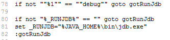 - In a Windows system, open and edit the setclasspath.bat which locates in the bin directory of your iServer installation folder. Find if not "%_RUNJDB%" == "" goto gotRunJdb, then add if not ""%1"" == ""debug"" goto gotRunJdb above it. Like this: