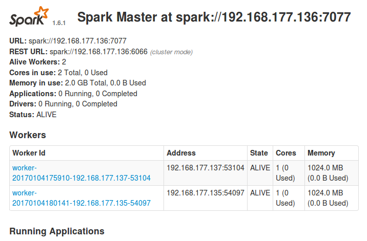 After starting, enter http: // sparkmaster: 8080 in the browser to view the cluster.
