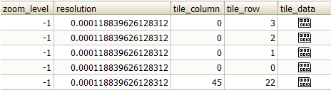 MBTiles format supports four fields: zoom_level, tile_colum, tile_row and tile_data in MBTiles1.1 standard. Based on MBTiles, SMTiles adds resolution field to support scale and resolution. zoom_level are -1, as shown below.