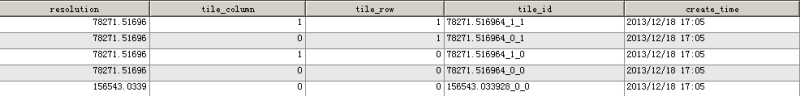 CREATE TABLE tiles (resolution double, tile_column integer, tile_row integer,tile_id text, create_time
