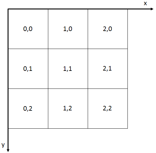 SuperMap iServer and iEdge support to read map tiles of the ZXY standard, in order to use OpenStreetMap and other Internet tile map services. The tiling rules for ZXY tiles are as follows: divide the map in full extent from the top left corner, from top to bottom and from right to left, into tiles of 256 * 256 pixels each. The upper left corner is numbered as line 0, column 0, and the number increases as it goes to the down and right directions. As shown below: