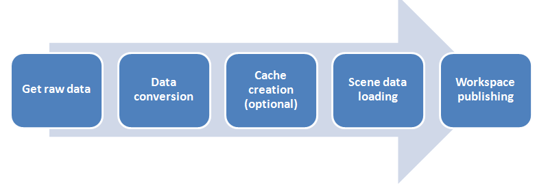 In many cases, however, users have data coming from various sources with different types. In this case, the data need to be converted and processed to generate corresponding 3D cache data before the data are loaded in a 3D scene. The overall flow of publishing a SuperMap 3D service is: