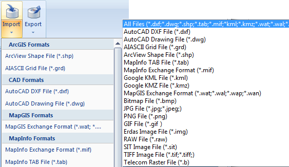 As described in Data in 3D scene, data types that SuperMap 3D services can publish include vector data, maps, images, terrain data, models, and KML data. Some of them are original 2D data, and some are 3D cache data. However, a user's original data come from various sources and they may not be the SuperMap data formats. So SuperMap iDesktop provides the data conversion module to solve this problem. Now the data conversion module supports importing 20 commonly-used data formats, which is located on the drop-down menu of the "Importing data" drop-down button. The corresponding file extensions that can be imported are shown in the figure below.