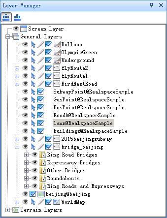 As in a 2D map, in a 3D scene, data are loaded onto the 3D globe as layers for display. For example, image data, terrain data, and vector data are all added in different layers for display. In a 3D scene, layers can be divided into four types according to their functions and the data contents contained: general layers, tracking layers, screen layers, and terrain layers.