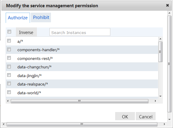 On the role editing page, the service instance list and the service providers, components, interfaces managed by current role can be viewed. Click the "Modify" button on the right side, the service instance list managed by current role can be modified.