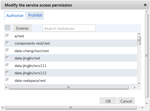 SuperMap iServer supports not only Authorizing for the service instances, but also the permission editing for specified roles, including service access authorization/ prohibition and service management function authorization / prohibition.