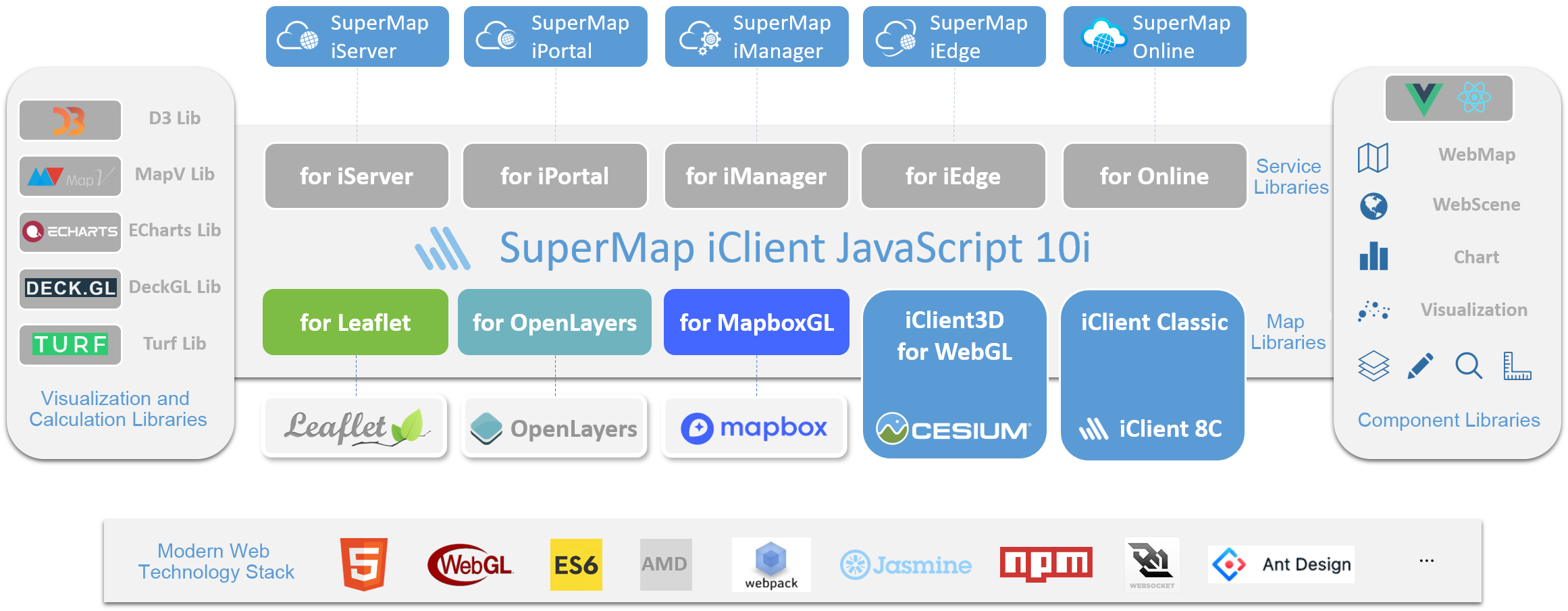 SuperMap iClient JavaScript 10i integrates Leaflet, OpenLayers and MapboxGL JS three mainstream JavaScript library packages for developing WebGIS clients. Provide iClient for legacy (SuperMap iClient for JavaScript 8C compatibility module), which helps you to implement version upgrade and migration easily. At the same time, it integrates the common mainstream chart library of ECharts, D3 and MapV. Presents a richer variety of visualizations.