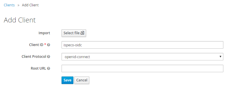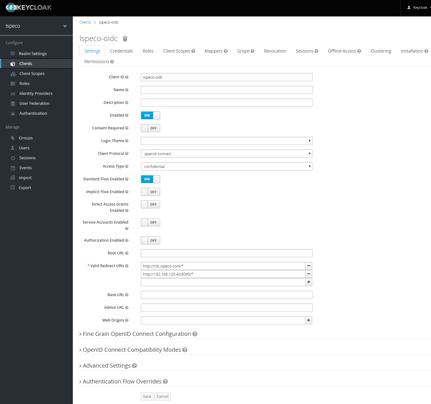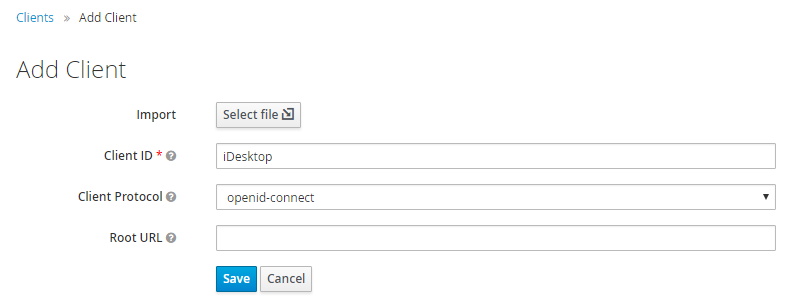 Take the created ispeco realm as an example to create a client. The client ID is named: iDesktop, which is a client ID name stipulated by SuperMap. The configuration is as shown below: