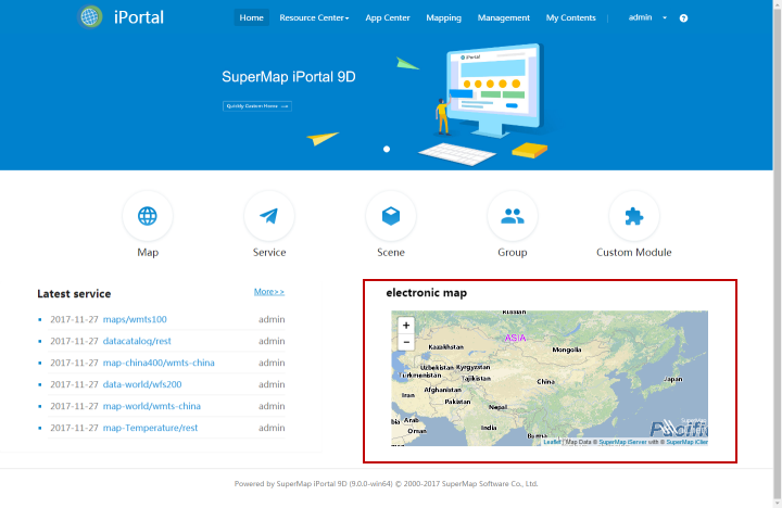 If the default home page content of iPortal can not meet your business needs, you can add customized UI components through the visual system layout of iPortal, to easily and heavily customize. Custom UI components have two kinds of edit modes, here we introduce you to a demo using source code edit mode - customizing to add "electronic map" components, namely: you can browse Amap in portal home page map, to zoom in and out, etc.