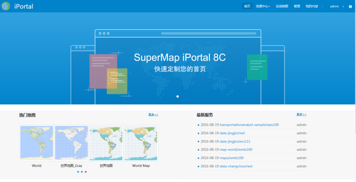 SuperMap iPortal administrator can customize the homepage contents, adjust the layout of the UI components on the home page and customize the UI components according to the portal's business requirements.