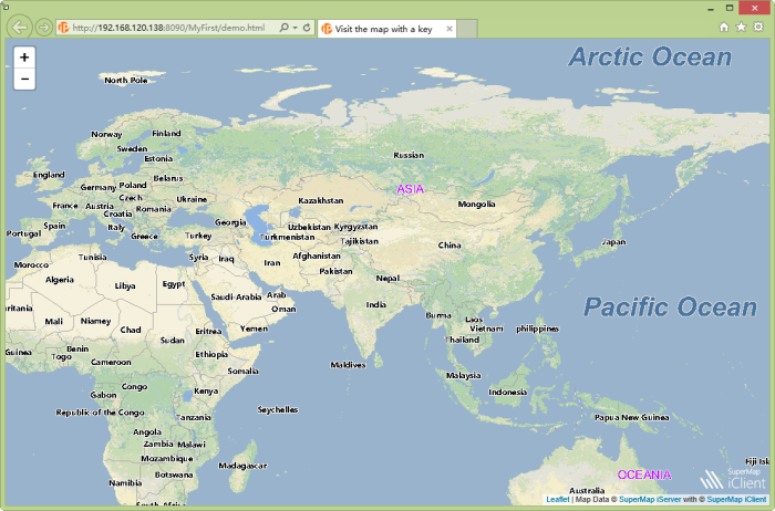 Copy the "MyFirst" folder to %SuperMap iPortal_HOME%/webapps directory, start SuperMap iPortal, enter in the browser address bar: http://192.168.120.135:8090/MyFirst/demo.html, browsing the map data.