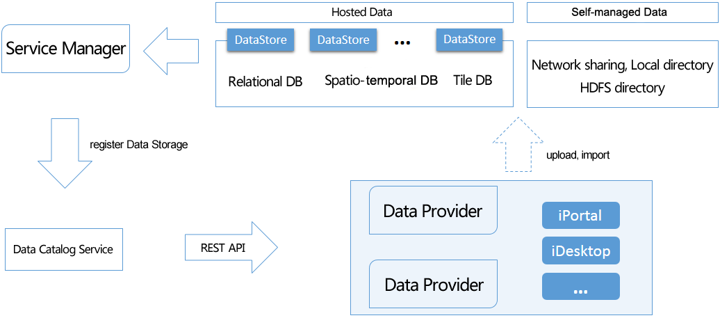 Data Storage: for both hosted data and self-managed data. Hosted data are those data of multiple typed managed in iServer DataStore; Self managed data are those data that are stored in the disk drive or HDFS.