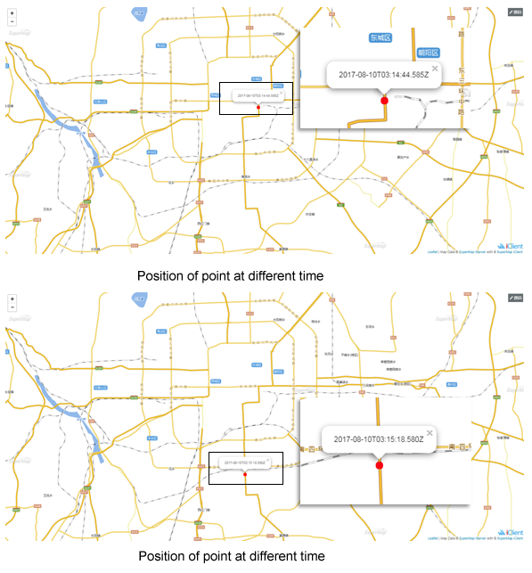 You can display data flow in the applications developed using iClient JavaScript 10i. Open the iClient data flow address: http://iclient.supermap.com/examples/leaflet/editor.html#dataFlowService, and view the data broadcasted in the map. Click “Source Code” on the top right to check the JavaScript source code.