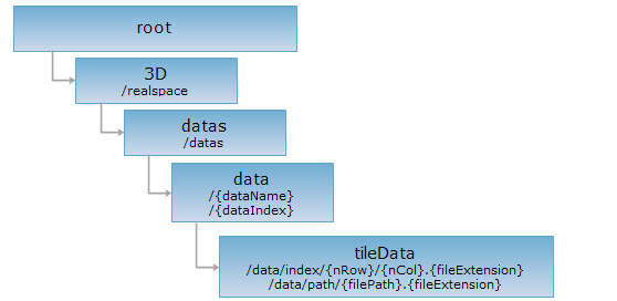 Tile data, i.e., cache files, can be identified either using the index of the tile data, or using the path of the data file. Therefore two types of URI template exist: URI1 is for accessing the tile data using the index; URI2 is for accessing the tile data using the path of the data file. The path of the data file in the latter case is a relative path (relative to the directory where the configuration file of the tile data is) and is separated with "/". Additionally, the tile data can be packaged and downloaded via URI2. Please see the detailed description of URI2 parameters for more information about how to download.