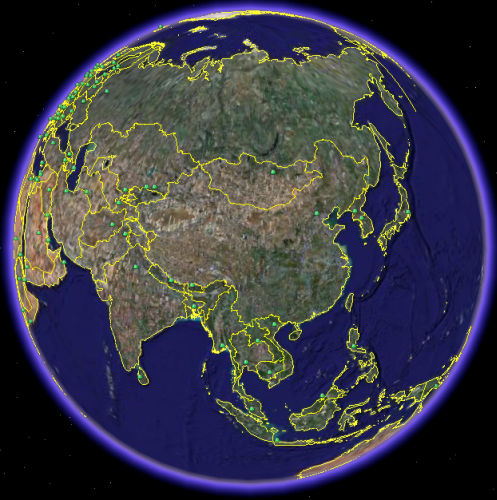 Access http://localhost:8090/iserver/services/data-world/rest/data/datasources/name/World/datasets/name/Capitals.kml in GoogleEarth to get the response as shown below: