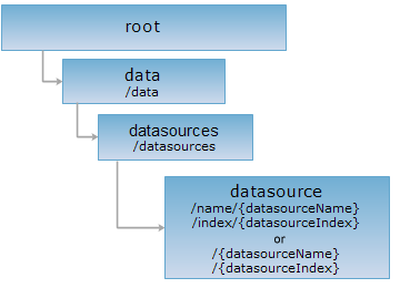 The datasource resource can be identified with 4 ways of URIs. URI1 identifies a datasource with /name/{datasourceName}, i.e., the "/name" tag and the datasource name. URI2 identifies a datasource with /index/{datasourceIndex}, i.e., the /index tag and the datasoruce index. URI3 identifies a datasource with /{datasourceName}, i.e., the datasource name. URI4 identifies a datasource with /{datasourceIndex}, i.e., the datasource index. datasourceName is used to identify a datasource resource with a higher priority.