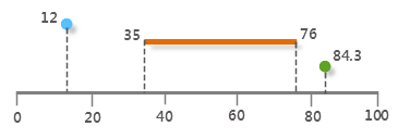 The following is a diagram of linear reference, the line at the bottom is a line segment with measure value (such as road, pipeline, etc), the points and line segments on the line are the events on the line. They are describes as the point whose distance from the start location is 12 unit, the line start at 35 unit and end at 76, the point at the 84.3 unit.