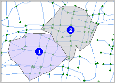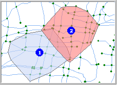 Service area: The area contains all the accessible edges and nodes, with the specified point as the center. In short, it is the area that a supply location of a specific service serves.
