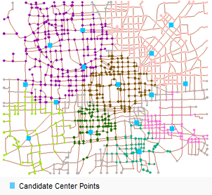 Example: 7 post offices will be built in an area with 15 candidate locations, represented by blue rectangles in the figure 1 below, that has no post offices. Which locations will be selected to build post offices depending on the following two conditions: no more than 30 minutes by walk for residents and the amount of residents a post office can serve is limited. Based on the two conditions, location-allocation analysis will give optimal locations and points out the service area of each post office. As shown is the figure 2 below, the red points represent the 7 selected locations for setting up post offices.