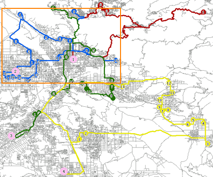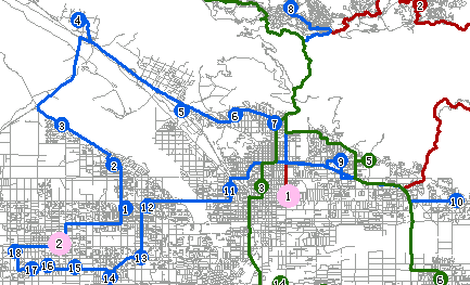 Figure 1 shows the analysis result, where the big circles represent the 4 newspaper supply locations (supply centers) and the small circles represent the newspaper retailers (destinations). Each color represents a solution for one supply center, including its destinations, the visited order and the delivery route. Figure 2 shows the delivery solution of Supply Center 2. Blue circles with numbers are destinations (18 in total) of the Supply Center 2. Newspaper will be delivered in the order indicated by the numbers on the blue circles, with the delivery man starting at the supply center, passing through 1, 2, etc., and then go back to the supply center.