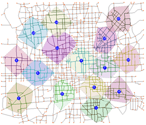 The following image shows what is the service area analysis result like and what problems the service area analysis solves. The blue circles in the figure below represent the supply center that supplies services. Areas in different colors are service areas of the supply center with different impedances.