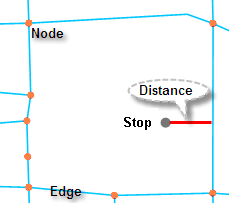 In principle, the network analysis can specify any point in the network as a site in the path analysis, The site should be near the network. If this point is not on the network (neither on the arc nor on the node), The network analysis will attribute the site to the network based on the distance tolerance. As shown below, the orange dot represents the network node, blue for the arc, gray point for the site, the red line segment is the distance from the site to the arc AB, and if the distance in the set distance tolerance, the site is attributed to the arc AB.
